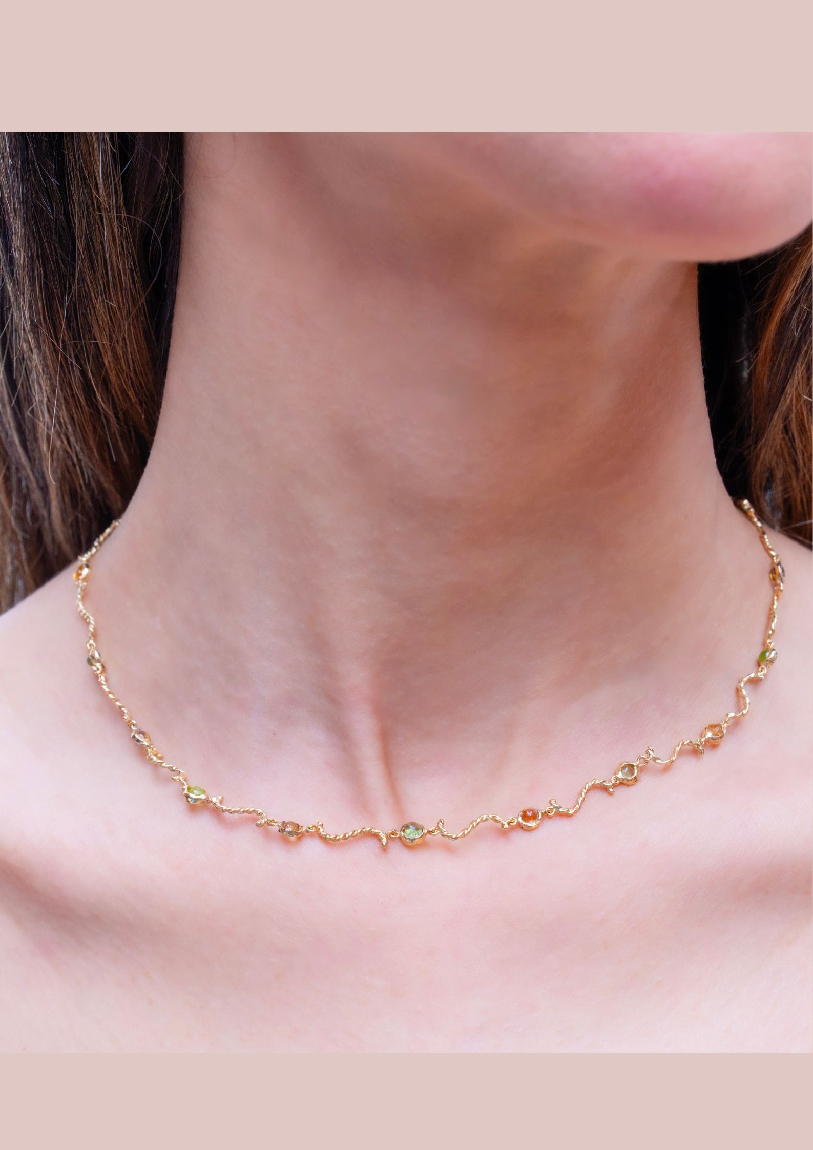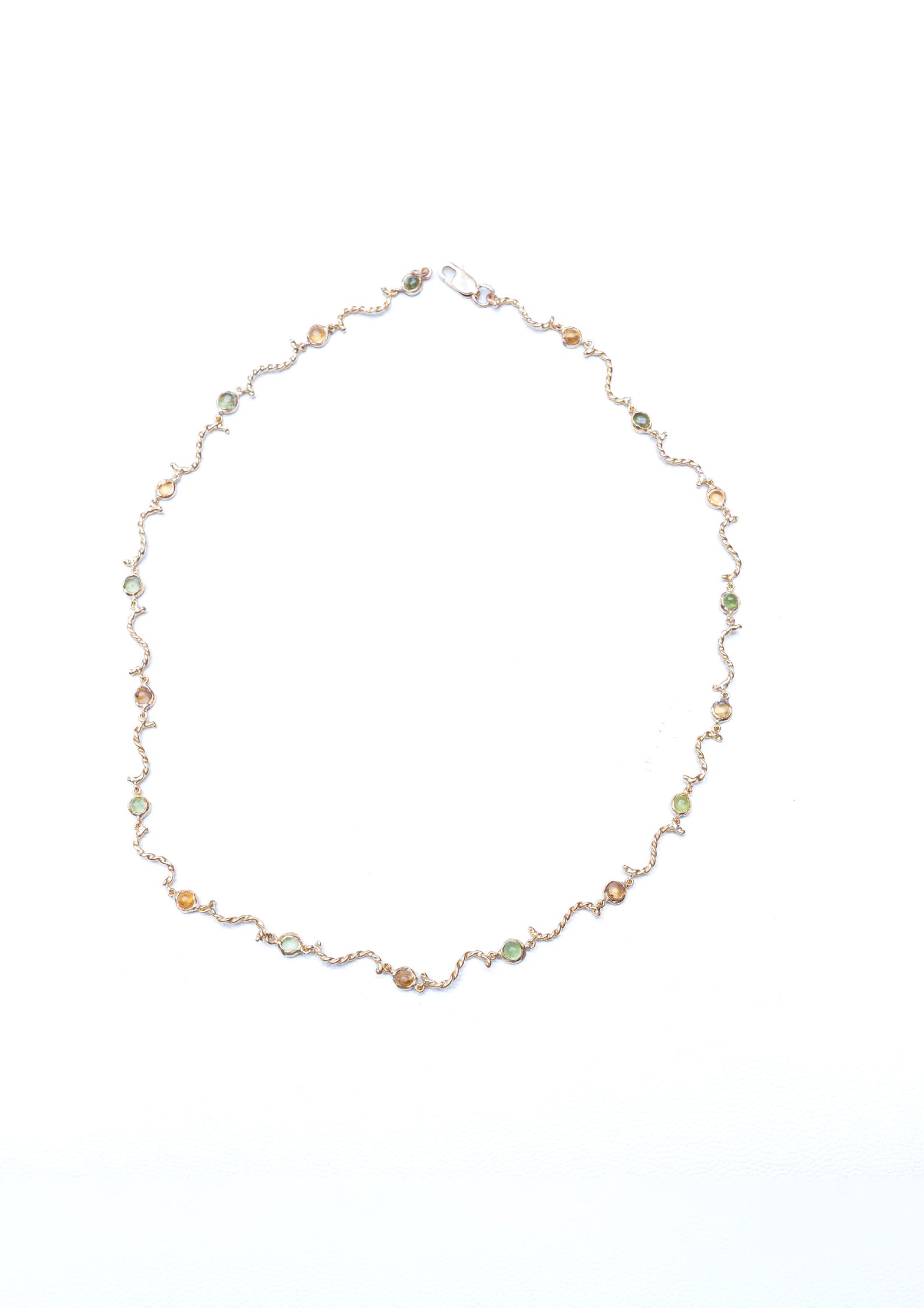 Cette gourmette en or jaune, délicatement torsadé, enlace des tourmalines scintillantes, symboles de protection et d’harmonie.